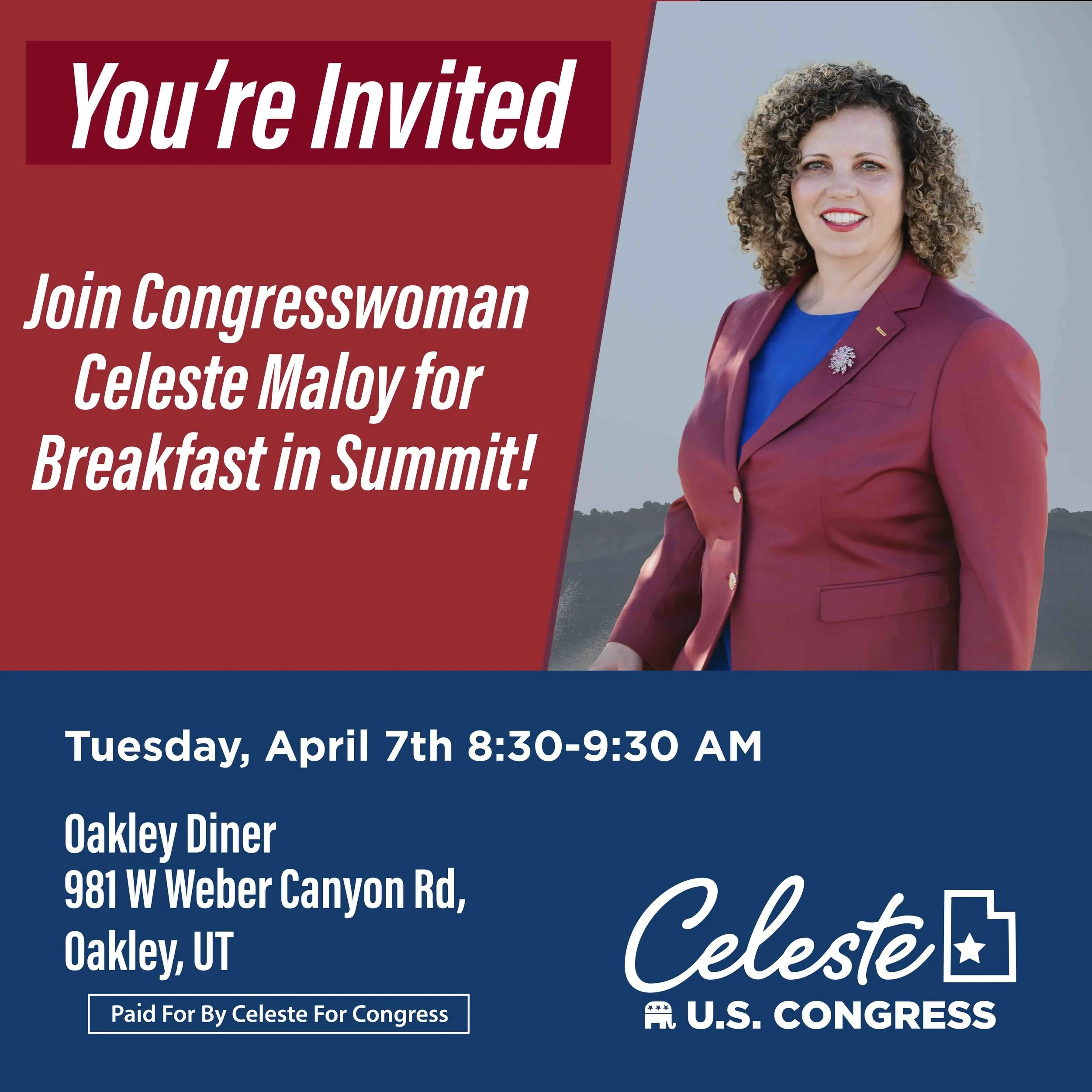 RSVP For An Event with Congresswoman Maloy!Summit County Breakfast at the Oakley Diner from 8:30-9:30am, 981 W Weber Canyon Rd, Oakley, UT 84055